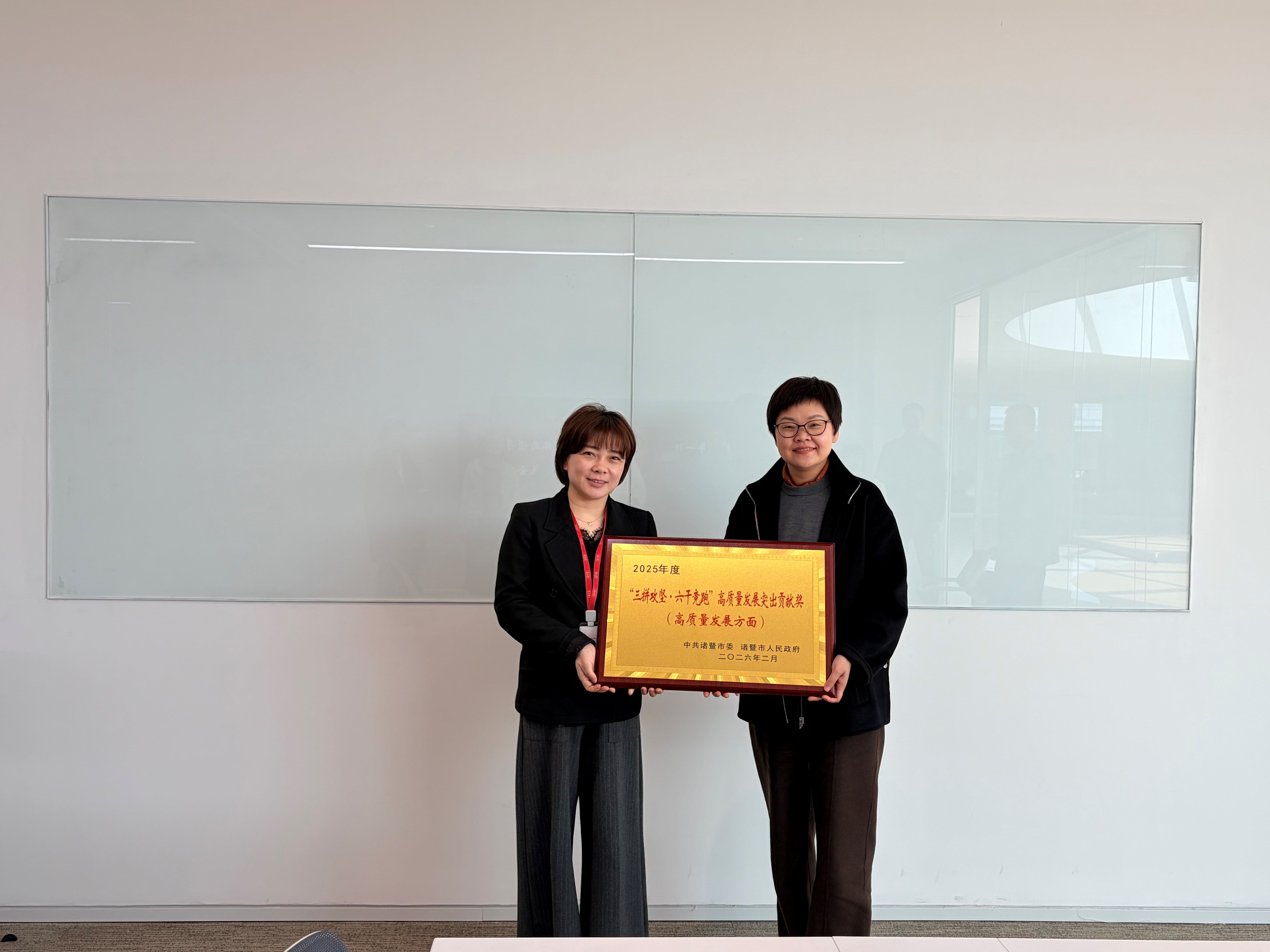 座谈期间,诸暨市委组织部常务副部长、诸暨市教体局党委书记、局长余灵君代表诸暨市委、市政府向钟子逸教育基金会颁发2025年度“三拼攻坚·六干竞跑”高质量发展突出贡献奖。